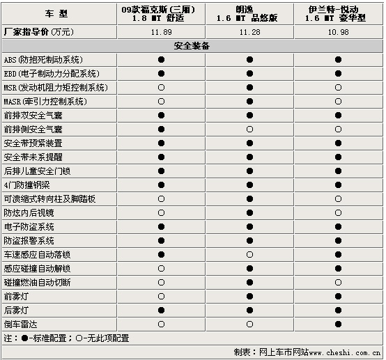 安全配置方面,09款福克斯的最大亮点是标配了前排侧安全气囊,但是低配车型没有前雾灯是一大遗憾。朗逸在安全方面则十分周全,尽管没有配备ESP,但ABS+EBD+MSR(发动机阻力矩控制系统)+MASR(发动机介入的牵引力控制系统)还是让其它两款车“望尘莫及”。悦动最大的亮点是配备了倒车雷达,而其它方面并无过人之处。