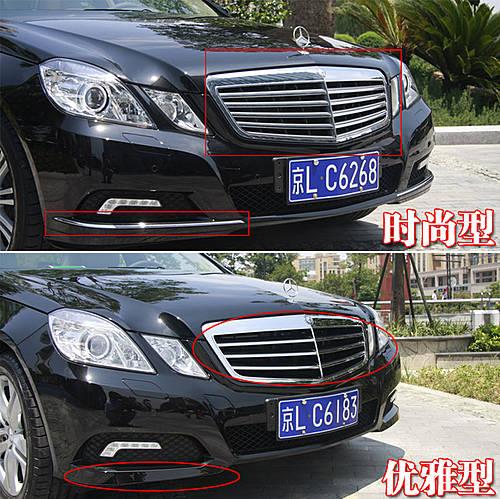 奔驰新E300优雅型和时尚型的前脸差异,主要体现进气格栅和前保险杠设计上。奔驰新E300优雅型前进气格栅为4镀铬横条设计,并且在前保险杠LED日间行车灯下配备了镀铬饰条。而奔驰新E300时尚型的进气格栅为3镀铬横条设计,并且前保险杠采用运动型设计。