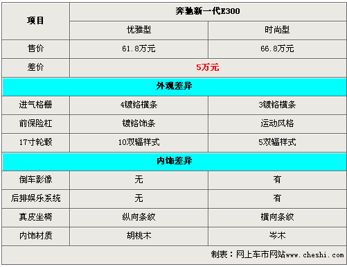 奔驰新E300优雅型和时尚型5万元的差价,主要体现在外观和内饰等配置上。奔驰新E300时尚型标配的倒车影像、17寸5双辐合金轮毂、横向条纹座椅、岑木内饰以及后排娱乐系统均没有出现在奔驰新E300优雅型上。