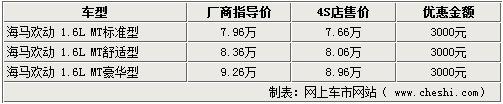 在市场中销售有段时间的1.6L欢动新车,现已进入各个海马经销商展厅,现车充足颜色齐全。在售的三款新车均为手动版车型。除直接享受国家1.6L车型的购置税优惠政策外,并有现金3千元优惠;销售人员表示,现金优惠也可换为等值的装饰礼包,同样超值。现金优惠配合购置税优惠,则大大减轻了消费者的购车负担。