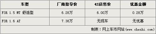 据比亚迪汽车北京地区4S店销售人员介绍,目前北京在售的比亚迪F3R只有1.5L手动舒适版车型,并且厂商指导价也从6.08万元回升到了6.28万元。目前购买此车的消费者可以得到2800元的优惠,经优惠后售价降到了6万元。