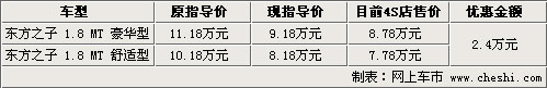 奇瑞东方之子在国内自主B级车中颇有盛名,畅销六年以来,已经逐渐成为国人的信任和骄傲。东方之子自从今年5月份官方降价2万以来,北京市场反响积极。在此基础之上,目前在北京市场购买东方之子现车,还可以得到4000元的现金优惠。具体优惠车型见下表: