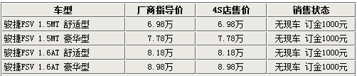 经销商透露,现在各店内的FSV基本为展车或已被客户预订的车辆,基本没有现车可以满足消费者的需要,消费者如需购买可以缴纳1千元订金后等待一个月左右即可提车。由于骏捷FSV为刚刚上市的新车,所以店内没有任何形式的优惠,请消费者谅解。