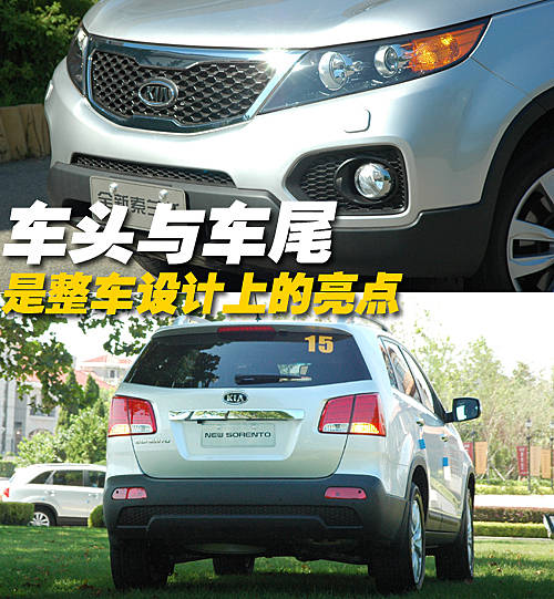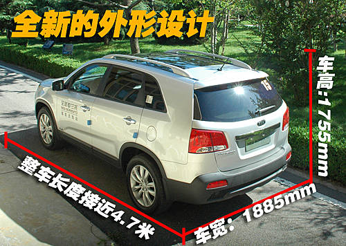 全新索兰托一改老款车型略显呆板的外观造型,全车头部线条锐利。整车线条非常流畅,车身尺寸为:长4685mm,宽1885 mm,高1755 mm,长度比老款车型增加了95 mm。前部保险杠以及车门多处的镀铬装饰显得非常有档次。
