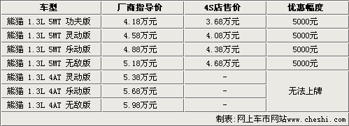 据吉利汽车4S店销售人员介绍,熊猫1.3L手动挡车型目前都有现车销售,而自动挡虽然已经上市,但由于北京地区无法上牌,所以还没有现车抵达北京市场,预计最早会在今年年底前解决无法上牌的问题。目前熊猫1.3L手动挡全系可以优惠五千元,而这款车型还增加了电动升级后窗,需要在原价的基础上加1000元。