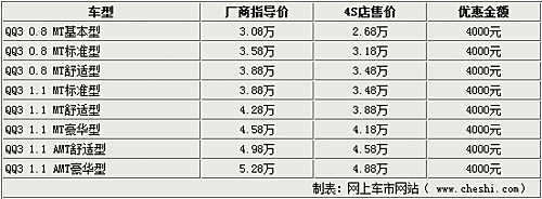 据奇瑞QQ3专营店销售人员介绍,奇瑞QQ3系列车型比较齐全,只有1.1AMT车型现车较少。但目前QQ3全系都有一定的优惠幅度,除现车较少的车型需要提前预订以外,全系车型均可以优惠4000元。
