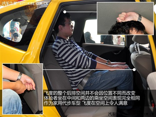 但飞度的后排腿部空间达到了两拳,这是十分出色的表现。不过我们也注意到,飞度之所以能有宽裕的腿部空间,和其较单薄的前排座椅设计不无关系。最后值得肯定的是,飞度的后排地板比较平坦,中间乘客的脚可以在不妨碍旁人的前提下放在舒适的位置上。