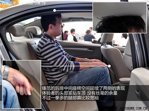 得益于较长的轴距,锋范在内部纵向空间上的表现的确出色。但由于前排座椅设计的更为厚实一些,因此体验者的腿部空间依然是和飞度上相同的两拳。即便是换坐到中间座位,腿部依然有较出色的一拳多。此外锋范的后排地板和飞度一样属于略有凸起但不影响舒适性的范畴。不过锋范在内部垂直空间的表现上实难令人满意,虽然车顶有为争取更多头部空间而设计的内凹造型,但实际效果不明显。总之坐在锋范内,体验者的头部压抑和不适感十分明显。