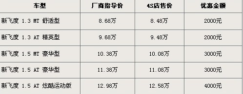 据广州本田北京地区4S店销售人员介绍,新飞度在售车型分为1.3L及1.5L共5个车型在售,最低售价8.48万元,全系车型优惠金额2千-4千不等。目前新飞度销售火爆,部分车型及颜色需要预定。北京地区各4S店由于订单不同,各店销售的现车颜色有所不同。