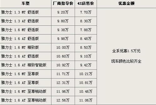 据广汽丰田北京地区4S店销售人员介绍,现在购买雅力士车型全系优惠现金1.5万元。目前雅力士1.3排量和1.6排量均有现车供应,现车颜色以黑色、紫色、银色为主。北京地区各4S店由于订单不同,各店销售的现车颜色有所不同。