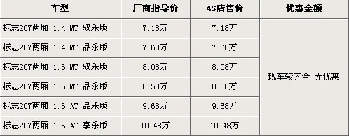 据东风标致北京地区4S店销售人员介绍,标致207两厢共有6款车型,售价区间为7.18万-10.48万元。目前标致207两厢全系暂无现金优惠,并且现车比较全。