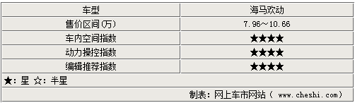 “动感外形”、“灵动操控”、“德系品质”是海马欢动最为突出的三大卖点,从用户的体验角度,被形象地概括为“三好”:好看、好开、好用,因此欢动又被称为“三好轿车”。海马欢动搭载海马自主研发的HA-VIS-1.8Ⅱ型高效能发动机,不但动力强劲,而且燃油经济性出色。它是国内A级两厢车中首款搭载了CVT的车型,其CVT无级变速器较之传统液压助力式AT自动变速器技术更先进,换档极为平顺,不但能带来毫无顿挫感的操控享受,还能为欢动带来15%的节油提高。同时这款CVT还带有6速手动模式,可以为追求驾驶乐趣的消费者带来强烈的操控快感。
