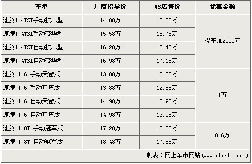 据一汽大众4S店销售人员介绍,速腾最新上市的1.4TSI车型已经到了少量现车,并且现在提现车的消费者需要在原厂指导价的基础上加价2000元才可提车。目前在售的速腾分为1.4TSI、1.6以及1.8T三种排量车型,购买1.6L车型的消费者可以享受到全系最高的1万元优惠,1.8T冠军版有6000元的现金优惠。