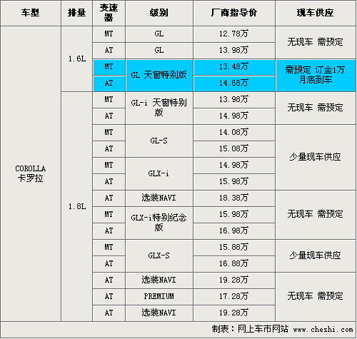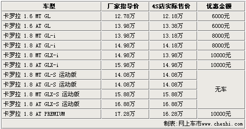 据一汽丰田4S店销售人员介绍:目前2.0L排量的运动版车型无现车销售,购买其他车型则可以享受到8000元——10000元的现金优惠。入门级的1.6 MT GL版车型售价降到了12.18万元,高配的1.8 AT PREMIUM版经10000元优惠后,售价也降到了16.28万元。