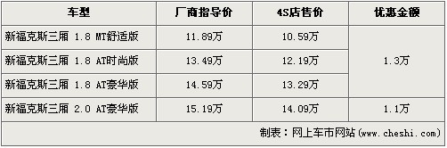据4S店销售人员介绍:目前福克斯三厢1.8升车型有1.3万元的优惠,经优惠后三款1.8L车型售价分别降为了10.59万元、12.19万元和13.29万元。2.0L车型有1.1万元的优惠,优惠后售价降到了14.09万元。