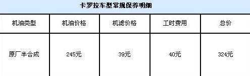 同样,这台发动机在国内服役时间也比较长了,因此保养费用也不会太高。通过调查,卡罗拉每5000公里进行一次机油保养的284元,同时卡罗拉享受一次免费的机油机滤的保养费用为324元。