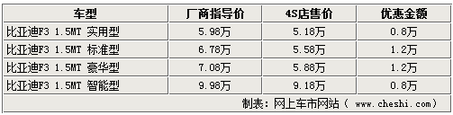 作为比亚迪汽车旗下的重点产品,比亚迪F3在今年又推出了智能白金版,新款车型增加了无钥匙系统、智能娱乐通讯系统等高端配置,使这款自主品牌家用轿车的竞争力更加突出。网上车市网站了解到,虽然比亚迪F3智能白金版上市时间不长,但目前优惠幅度有所提升,经销商处全系最高可给出1.2万的优惠。详情如下: