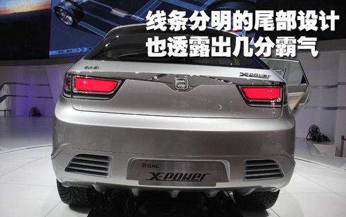 从尾部看上去,广汽X-power概念SUV的线条非常分明,但由于尾灯的配合,显得非常霸气。这款SUV的尾灯采用红色的设计,四周配备了镀铬装饰条,而且尾部还设计了扰流唇和造型独特的排气口。