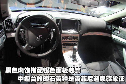 内饰的风格依然保持了英菲尼度家族式的风格,中控台中央的石英钟无疑就是它典型的的家族特征。黑色内饰搭配银色面板装饰,沉稳中不失活力。