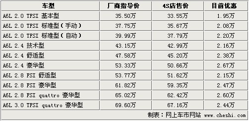 编辑点评:奥迪A6L 2.4升排量车款为主打车型,我们更推荐2.4升技术型和舒适型,价格适中配置也较为丰富,目前优惠幅度相对较大。如果您对配置方面要求不高,我们推荐2.0TFSI标准版车型,动力性比2.4升车型更好,价格也更低。2.8升及3.0升车型符合那些对于动力性要求较高的消费者,但销量要比2.0TFSI和2.4车型少很多。