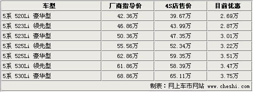 据宝马4S店销售人员介绍:目前宝马5系最高优惠3.75万元,部分车型有现车,520Li领先型由于销量不好,所以现车极少,目前2.0排量车型只有520Li豪华型。523Li系列车型无现车,预订等1个月时间。525Li系列只有豪华型有现车,颜色也为银色;523Li及525Li领先型车款预订需等1个月时间。530Li系列无现车,预订需等1个半月。目前最高优惠可达3.75万元,优惠幅度较一般。