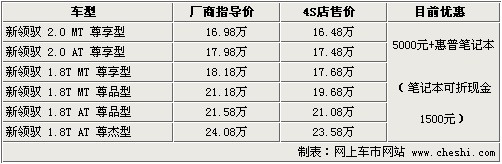 据4S店销售人员介绍:目前新领驭全系可优惠5000元,较之前优惠有所增加,除此之外还可送“3G礼包”,包括一台HP惠普笔记本电脑。如果不想选择笔记本电脑,可折现金1500元。目前车源方面,2.0升手动尊享型及1.8T手动尊品型无现车,其余车型现车较充足,预定需等3-4周时间,银色、黑色车型等待时间较短。