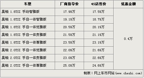 据北京斯柯达经销店销售人员介绍,斯柯达昊锐共分为8个车型,售价区间为17.99-25.09万元。目前店内昊锐全系有4000元的现金优惠,经优惠后,昊锐的售价区间降为了17.59万-24.69万,并且店内的昊锐现车比较充足,消费者挑选的空间也较大。