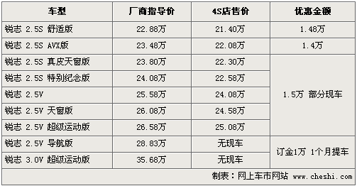 目前锐志的在价格优惠方面基本和11月保持一致,其中入门级舒适版优惠1.48万,最低售价为21.40万,2.5真皮版以及天窗版等优惠1.5万元,部分店内还推出了赠送保险等相应活动。而3.0排量一直没有现车供应,还需要订车。锐志全系车型较多,一般购买车型主要集中在舒适版和纪念版,消费者可根据需要选购。
