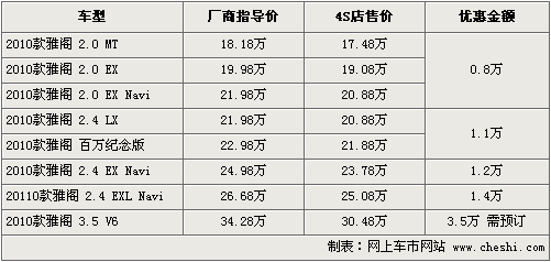 据广州本田4S店销售人员介绍,目前老款雅阁车型已停产,销售车型均为2010款。顶级车型购买可优惠3万元,2.0自动档标配可优惠8千元。现在店内现车比较紧张,大部分车型颜色需要预订,订金为2000元。如消费者有意购买,到店详谈会有更优惠的价格。北京地区各4S店由于订单不同,各店销售的现车颜色有所不同。
