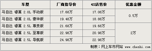 据一汽马自达4S店销售人员介绍,马自达6睿翼目前全系车型最高可以优惠现金2万元,2.5排量三款车优惠后最低仅售19.68万,其中2.0排量车型目前也可以优惠现金5千元。本月底经销店内有黑色、银色、紫色等现车供应。