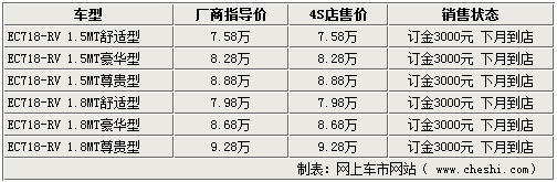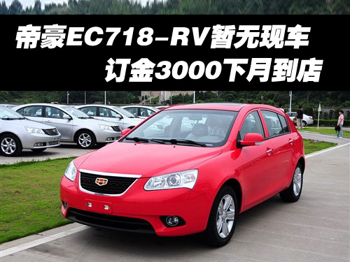 吉利帝豪经销处工作人员表示,现在店内的帝豪EC718-RV新车不全,但是很快将充足货源,届时将可满足消费者的购车需要。现阶段各家店内的EC718-RV及EC718车型均维持厂商指导价,暂时没有任何现金优惠。消费者购车需要提前预订,订金为3000元并需要等待一个月的时间。