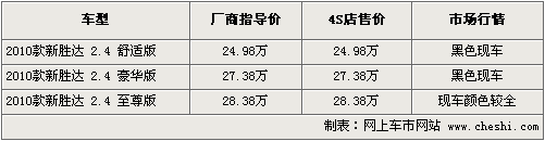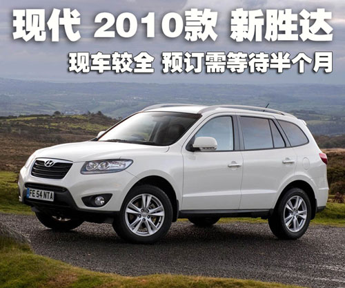 据现代汽车4S店销售人员介绍,2010款新胜达目前至尊版现车较全,现车颜色有黑色、白色、银色、蓝色、铜色可供选择,其余两款车型有黑色现车供应,如需预订其他颜色需交订金1万元,等待15天左右可提到车。北京地区各4S店由于订单不同,各店销售的现车颜色有所不同。