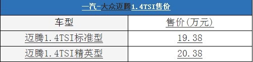 1月23日,一汽-大众正式推出迈腾1.4TSI车型,此次推出的迈腾1.4TSI包括两款车型,迈腾1.4TSI标准型和迈腾1.4TSI精英型,具体售价如下表所示: