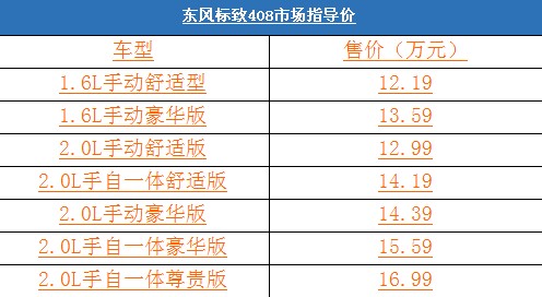 1月25日,东风标致408在北京全球首发上市,共推出1.6L和2.0L排量7款车型,售价12.19-16.99万元。这是标致汽车品牌创立120年以来,首次在海外市场全球首发其最新一代车型。这不仅显示出中国市场日渐提升的重要地位,更凸显标致汽车乃至PSA标致雪铁龙集团的中国战略重心的进一步确立。具体售价如下表: