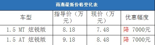 近日,编辑从北京地区综合经销商处了解到,近期雨燕的现车比较充足,颜色也比较齐全,基本可以满足消费者的需要;目前购车全系有7000元的现金优惠。据经销商透露,消费者要想以这个价格提车,需要在店内做一条龙服务,其中车辆四项基本保险可以打9折(约合3400-3600元左右)。以下是雨燕最新价格变化表: