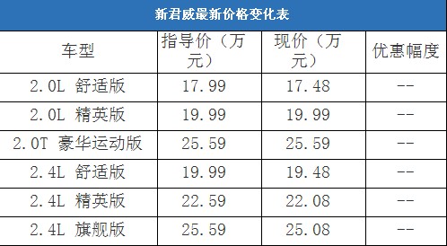 今日,编辑从北京地区通用别克4S经销商处了解到,新君威的现车十分紧张,只有少量2.0T车型,消费者现在预订该车的话勉强能够保证在春节前提车。据经销商透露,因为新君威一直热销,车源比较紧张,所以消费者购车没有任何优惠。以下是新君威最新价格变化表: