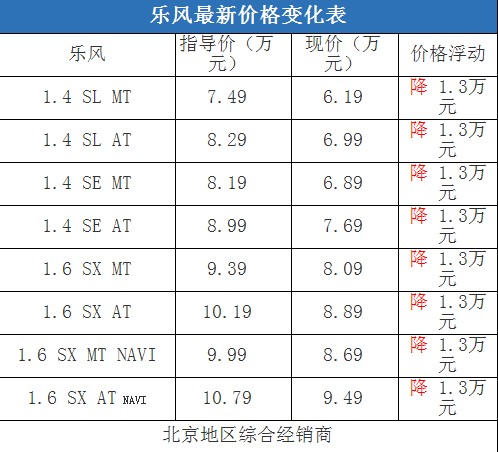 乐风是一款追求性价比的家用小型车,外形一改老款乐风稳重平庸的造型,添加了运动和时尚的元素,更加符合现代大众消费者的审美;内饰采用三筒式仪表盘,造型运动新颖;内部空间也足以让挑剔的家用消费者满意。我们认为,近期乐风的降价幅度比较大,性价比很不错,喜欢该车的朋友不妨考虑近期入手。