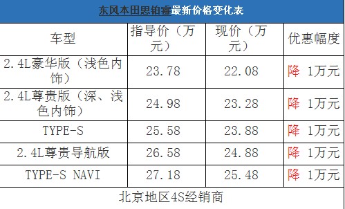 近日,编辑从北京地区东风本田4S经销商处了解到,目前思铂睿在店内有少量现车,购车全系可以优惠1万元现金。以下是思铂睿最新价格变化表: