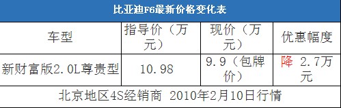 近日,编辑从北京地区比亚迪4S经销商处了解到,近期比亚迪F6有2.0L尊贵版现车(黑色、银色)。目前这款车在店内正在组织消费者团购活动,车辆全款(包括购车一条龙和购置税、上牌)为9.9万元,并且赠送价值1000元的汽车装饰,相当于优惠了2.7万元左右。以下是比亚迪F6最新价格变化表: