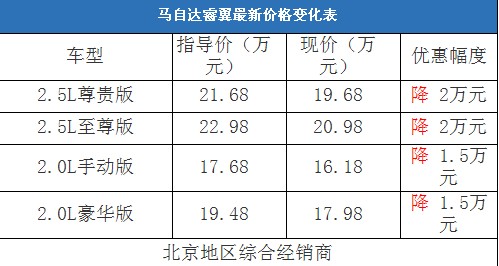 近日,编辑从北京地区一汽马自达4S经销商处了解到,睿翼的2.0L车型和2.5L车型都有现车在售,2.5L车型在4S店的优惠为8000元,而上市不久的2.0L车型只有礼包赠送。相比之下,综合经销商处的马自达睿翼优惠幅度非常大,2.5L车型已经跌破了20万元,2.0L车型也有了1.5万元的现金优惠。以下是马自达睿翼最新价格变化表: