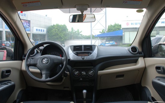 新奥拓的内饰里可以看到不少熟悉的元素,比如方向盘就跟雨燕一模一样。仪表盘设计得很可爱,转速表被单独放置在中控台左角,小表盘增加了一些卡通色彩。而常规仪表盘的位置只有一个超大的表盘,显示的是时速,读取行车信息因此相当便利。新奥拓的内饰设计整体人给人感觉是比较大气,不太像一款微型车的感觉,这里面可能有复合式中控台的因素。