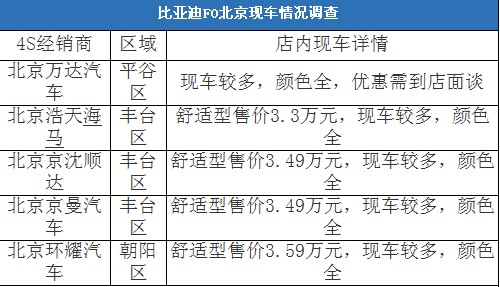从调查的结果来看,各4S店内,比亚迪F0现车数量均比较充裕,可选的颜色也比较全,随时到店均可提车。价格方面,比亚迪F0的优惠还是比较大的,以售价为4.09万元的F0舒适型为例,大部分的4S都报出6000元的现金优惠,其中北京浩天海马的报价最低,仅为3.3万元,为全北京市最低价格。不过经销商表示,该价格随时都有上涨的可能。