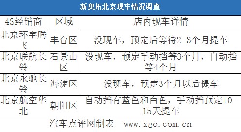 新奥拓仅有1.0L排量3款车型可选,其中卖的最好的应该是自动挡车型。北京地区长安铃木的4S经销商比较多,我们随机选择了4家经销商,其中仅有位于朝阳区的北京航空华北店有自动挡现车,颜色有蓝色和白色。手动挡车型没有现车,如果预定的话,10-15天可提车。剩下的三家4S店内都没有现车,预定的话,最快要等待2个月才能到店,最慢要等4个月才能到店。