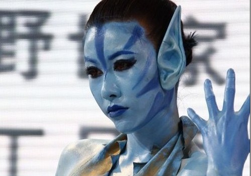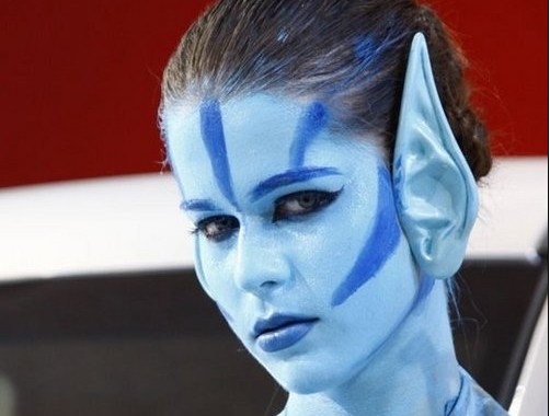 也许是因为阿凡达这部电影太火了,也许是厂家认为观众们的审美疲劳了,也许是厂家为了传达一个环保的意思,所以才会出此计策,让一位美女车模化身“阿凡达”,但是怎么感觉出很别扭呢,也许我还是喜欢正常点的车模吧。