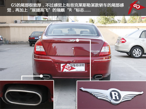 很喜欢G5的前脸设计,貌似自主品牌中用如此类型设计的车型极少,但是恰恰G5的引擎罩上的“R”标志,让肩负奇瑞高端品牌的G5在外观大气方面完全达到了要求。
