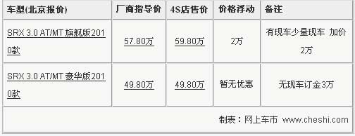 据北京凯迪拉克4S店销售人员介绍:凯迪拉克新SRX分为3.0L豪华版以及旗舰版两款车型,售价分别为49.8万元和57.8万元。近日,经销店内有新SRX旗舰版现车,欲购买者需在原厂商指导价的基础上加价2万元才可提车。高配的豪华版车型店内无车,需交订金3万元。