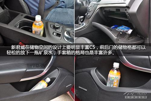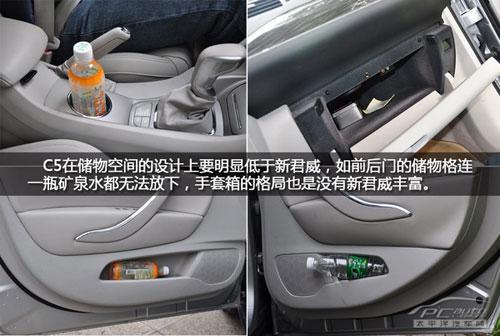 车内储物空间我们用的是“饮料瓶”来衡量看看究竟那款车更人性,新君威车内的储物空间设计相当人性化,前后侧门的储物格能放进去饮料瓶,手套箱的储物格局也是很丰富,排挡前方预留了2个饮料瓶的储物槽,但是中控台上方对于票据、钱包、手机等杂物空间设计就没有C5那么人性。