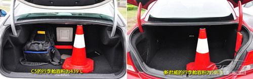 在车身尺寸方面新君威比C5车身长度和高度数据要好一些,分别多出25mm和26mm。而轴距上C5却要长出新君威78mm,也比新君威宽了4mm,在同级车里面也拿得出手,在实际体验中,C5的后排头部空间受益于内凹处理方式以增加头部空间,显得很充裕,所以无论是商用还是家用空间完全够用,腿部空间也够用,而新君威由于轴距较短且是运动化的定位,后排空间表现并不理想,腿部空间只能说够用,且头部空间则略显局促。