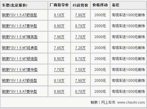 骏捷FSV共有8款车型在售,分为1.5 L和1.6L两种排量,价格范围是6.98-8.98万元。据4S店销售人员介绍,目前全系车型在厂商指导价的基础上现金优惠2000元,此外还赠送价值1000元的装饰大礼包,车型颜色比较齐全,如果感兴趣的朋友可联系经销商。