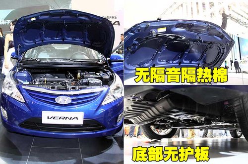 北京现代Verna的发动机舱布局比较规整,走线合理。在发动机盖上辅以隔音材质,同时在靠近发动机后方的部分也设有隔音、隔热层。车辆底部没有装备的底盘护板,使Verna在复杂路面行驶时其底盘少了一重保护,而且这款车型的发动机舱盖开启没用采用液压杆的设计。